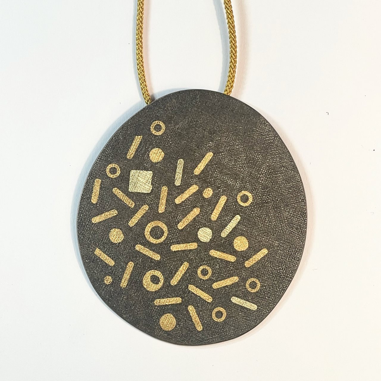 Fine gold, 18ct green gold, shibuichi, sterling silver tube, yellow Japanese kumihimo eight strand braided cord. Image: Diarmid Weir.