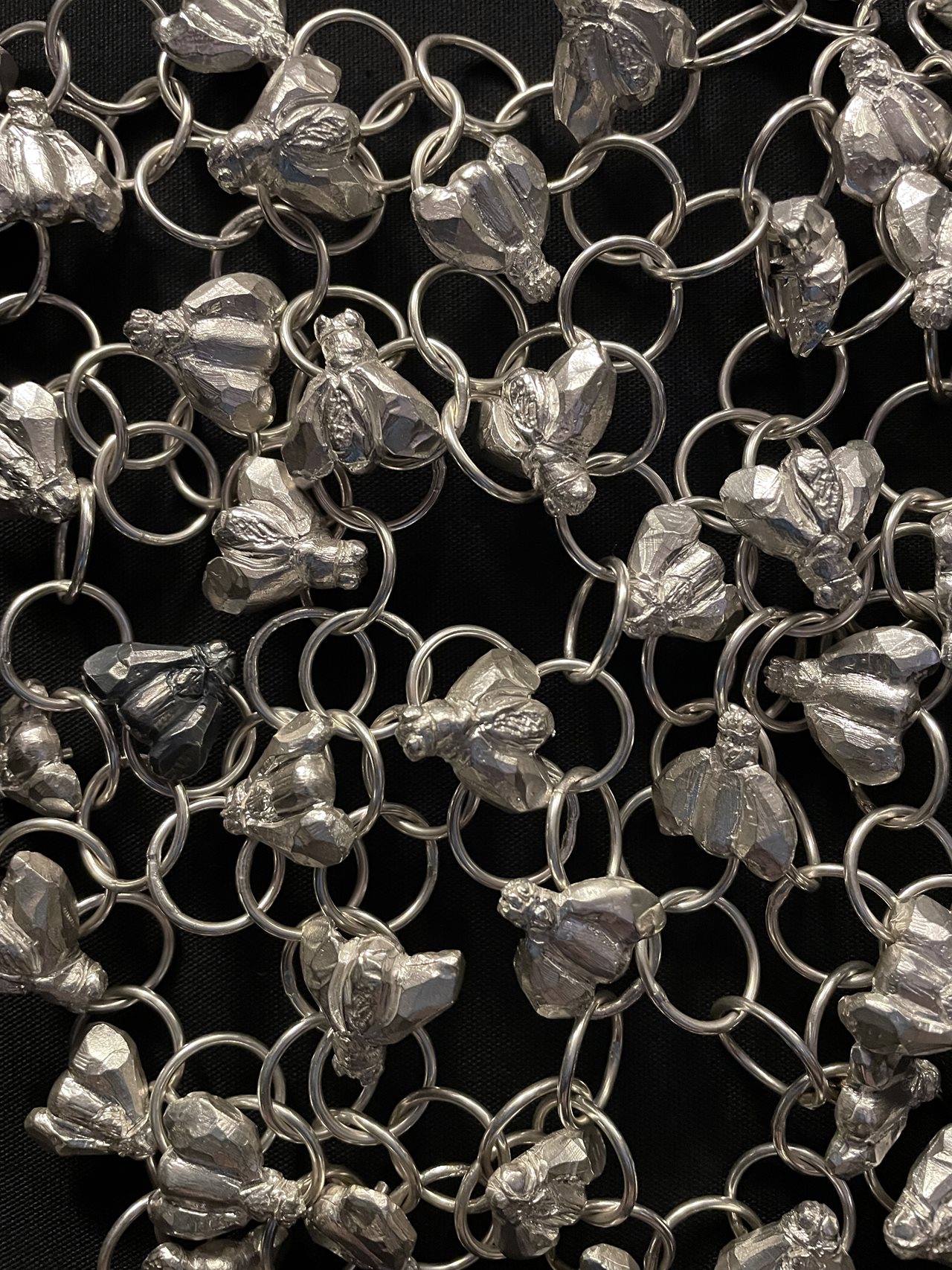 Flypaper explores the proverb “Don’t put flies in my head” by looking at how doubt, influence, and half-truths settle in the mind before we even notice. Flies, usually treated as signs of decay, shift here into quieter messengers — carriers of mixed signals and the ways meaning gets bent by others. The silver mask, weighted with forty-one cast flies resting on chainmail, interrupts vision and slows down certainty. Day forty-one, the moment after temptation ends, holds a fragile kind of clarity. The work sits in that uneasy space where perception wavers and persuasion quietly takes root.