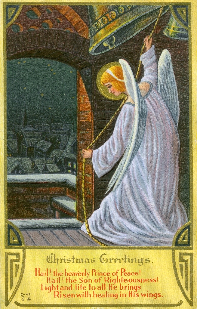 Reference: https://commons.wikimedia.org/wiki/File:Christmas_Greetings._(Angel_ringing_a_bell_overlooking_a_village).jpg