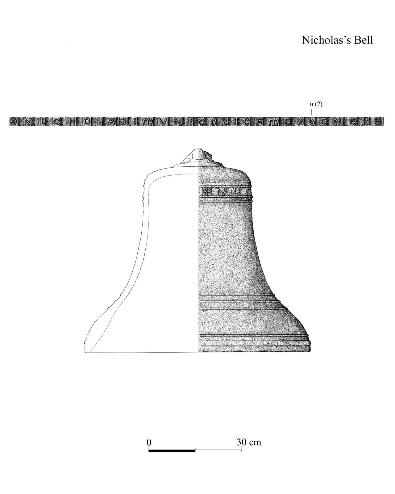 Nicholas – “NICHOLAS: MVN: CVR: OFMEBEGINER” Nicholas: municipality: curator: Of me beginner (OFMEBEGINER is Middle English and literally means ‘began me’ but perhaps really refers to Nicholas commissioning the bells to be made)