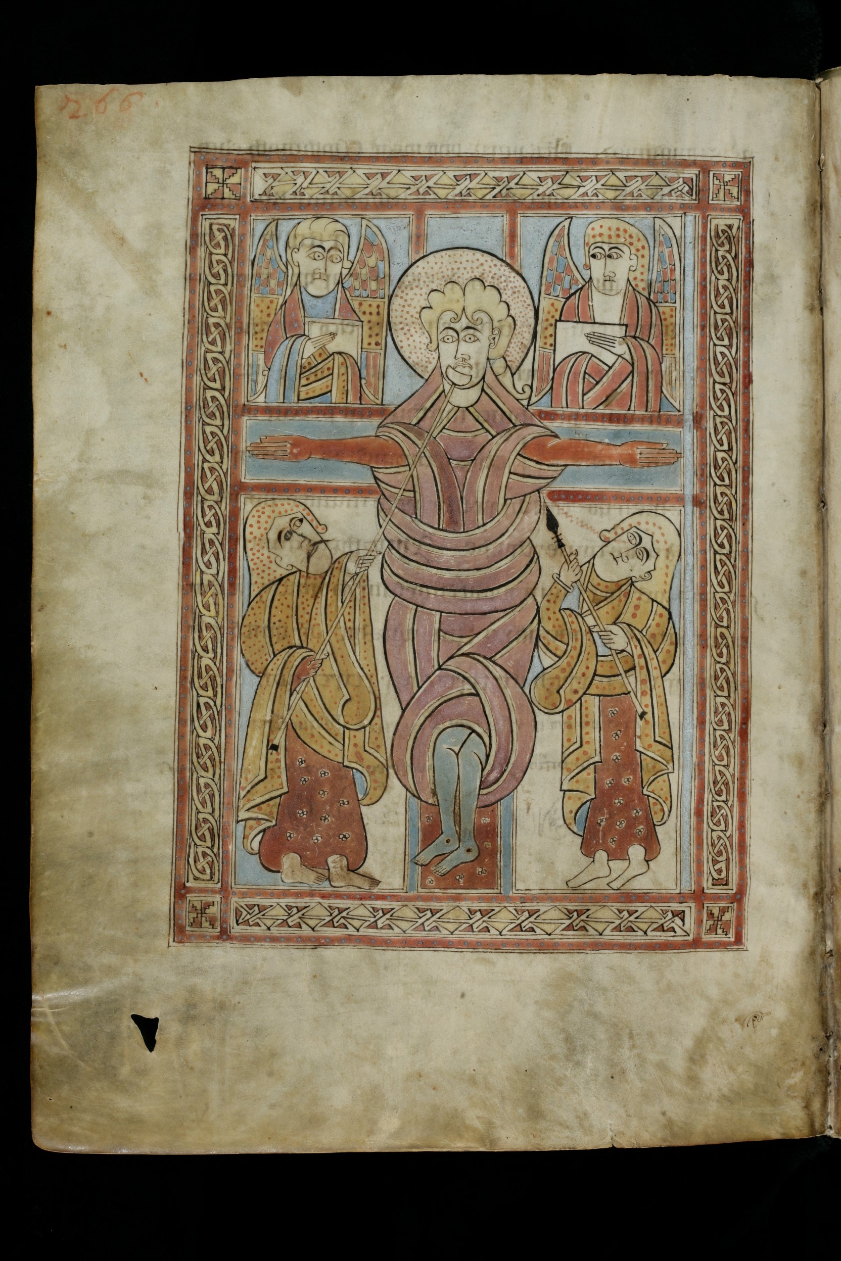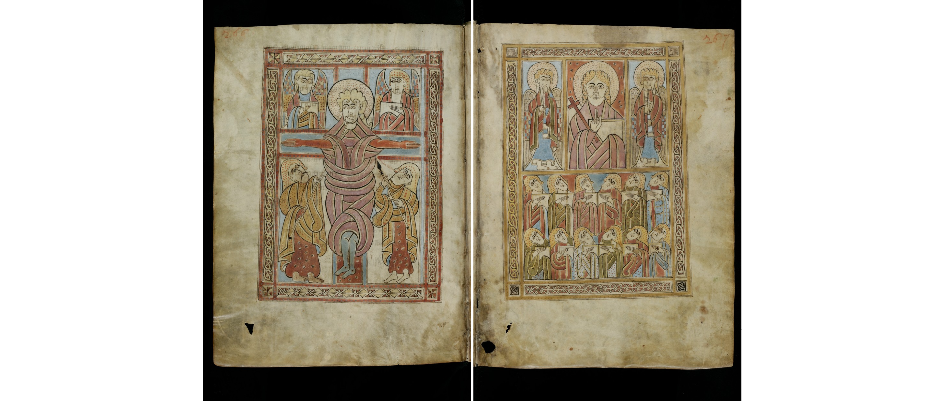 This juxtaposition of the death of Christ ‘made flesh’ and his triumphant return as a divine being is unique among the surviving early medieval Irish manuscripts, and the depictions of both scenes may count as the earliest in Irish art. The Crucifixion in Cod. Sang. 51, p. 266 has been discussed at length in an earlier blog (An Irish Crucifixion). The depiction belongs to a peculiarly Irish Crucifixion tradition that is attested across manuscripts, metalwork and carved stones from early medieval Ireland. Particularly distinctive of this tradition is the treatment of Longinus, the soldier who pierces Christ’s side with a lance, and Stephaton, the bystander who is said to have dipped a sponge in wine vinegar and put it on a stick for Christ to drink. While representations of this scene in artworks from outside of Ireland place Longinus to the right and Stephaton to the left of the cross, Irish depictions show the reverse positioning, perhaps because of an Irish tradition that Longinus’ spear caused Christ’s heart to burst. An 8th- or 9th-century Crucifixion plaque from Rinnangan, Co. Roscommon, which is also on display in the Words on the Wave exhibition, offers a close parallel in metal for the scene in Cod. Sang. 51.