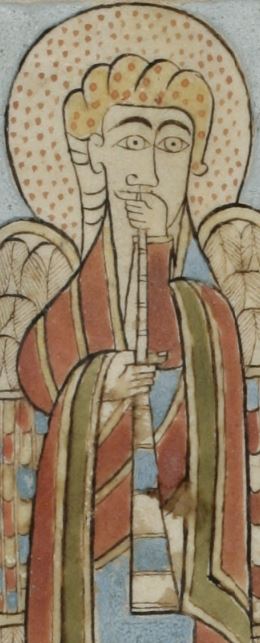 An interesting link between the Second Coming scenes in the St. Gallen and Turin Gospels is the form of the trumpets being blown by the angels in the respective depictions. In both cases the trumpets shown are long, straight-sided instruments that taper to the mouthpieces and are divided into several transverse sections, marked in alternating blue and white colours in Cod. Sang. 51. These conical trumpets have been compared to the ‘River Erne Horn’ discovered in Coolnashanton, Co. Fermanagh, in 1959 and now housed at the Ulster Museum in Belfast (reg. BELUM.A9637). This 8th- or 9th-century yew wood trumpet has a bronze mouthpiece and decorated bronze binding strips that divide its body into transverse sections. Though much longer and narrower, the ‘Bekan Horn’ from Co. Mayo in the collections of the National Museum (reg. 2823:W144), which has been radiocarbon-dated to c. 700, is similar in design, being a conical instrument made of yew with spiral bronze bindings. As elsewhere in the Words on the Wave exhibition, we see here the early medieval manuscript illuminators using the objects and dress of their own day to illustrate the Gospel narrative.