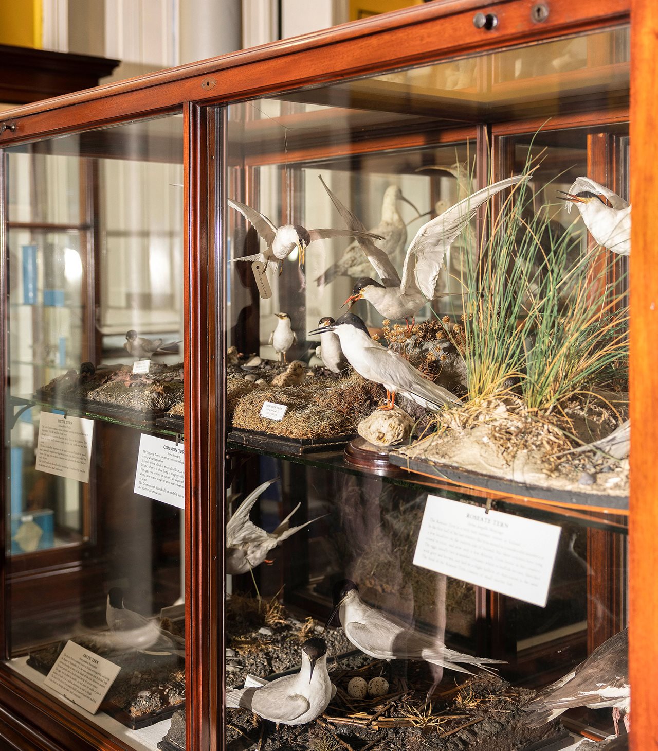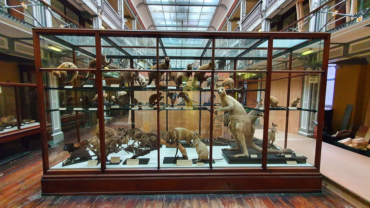 Before closing for renovation, the National Museum of Ireland, Merrion Street was a Victorian, cabinet-style museum, with high-density displays and a layout of collections which reflected zoological taxonomy. So, closely related animals were displayed together while distantly related animals were exhibited far away from each other. The exception is that Irish fauna was grouped together on the ground floor, while animals of the world were displayed across the first floor and two levels of balconies.