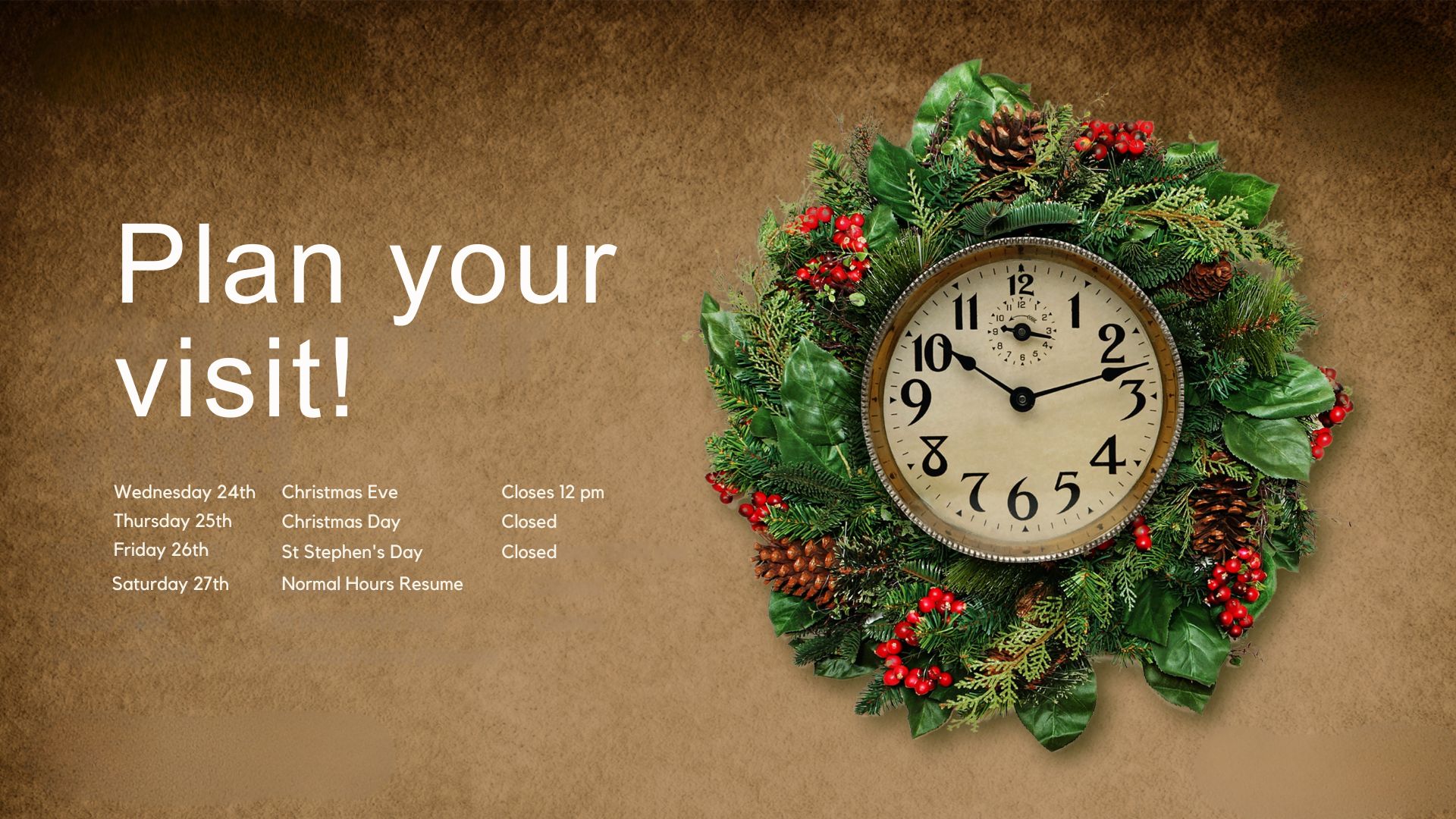We are closed to visitors at 12pm on Christmas Eve (Wednesday, 24 December); Christmas Day (Thursday 25 December); St Stephen's Day (Friday, 26 December).